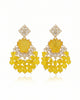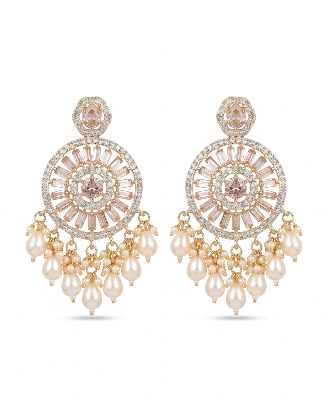 At the base, several beige drops that look like pearls hang elegantly, giving it movement and a touch of luxury. The top stud is made with a sparkly pattern that goes perfectly with the detailed details below.